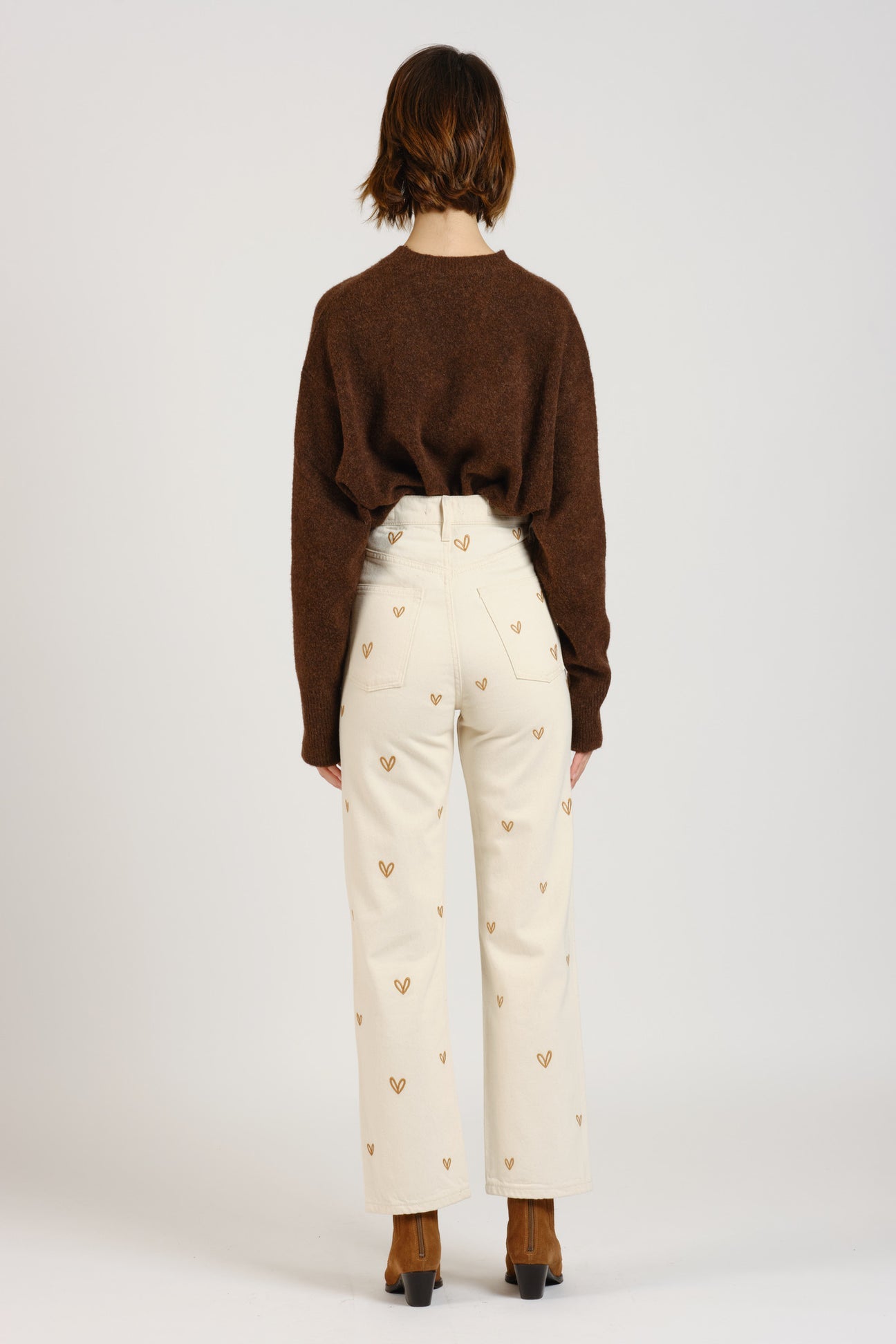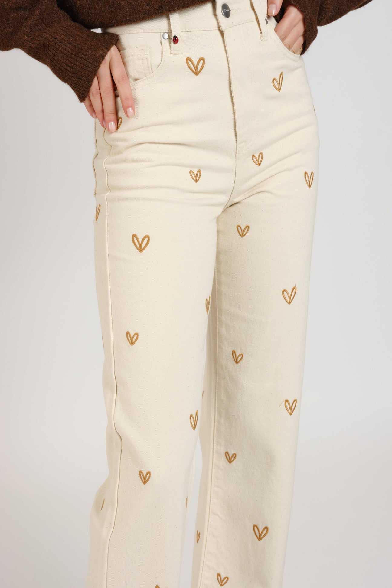 Fall for these timeless high-waisted jeans, reimagined with a delicate touch of heart embroidery. Their straight cut and greige color make them a versatile piece, ideal for both casual and elegant looks. Wear them with a T-shirt and sneakers for a casual look, or with a blouse and boots for a more sophisticated look.
