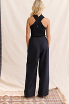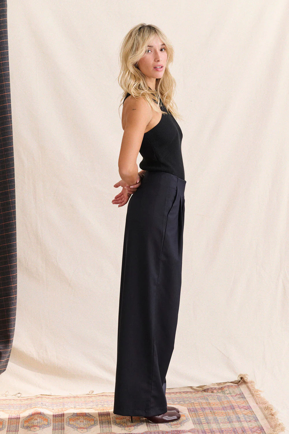 Le pantalon noir essentiel, revisité avec caractère. Sa coupe large et son tombé fluide offrent une allure assurée et élégante, tandis que les plis marqués structurent la silhouette. La taille haute affine la taille et allonge visuellement la jambe, pour un rendu à la fois féminin et moderne.