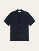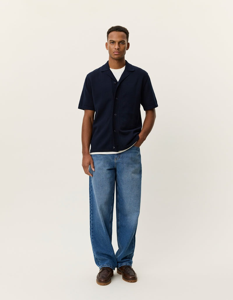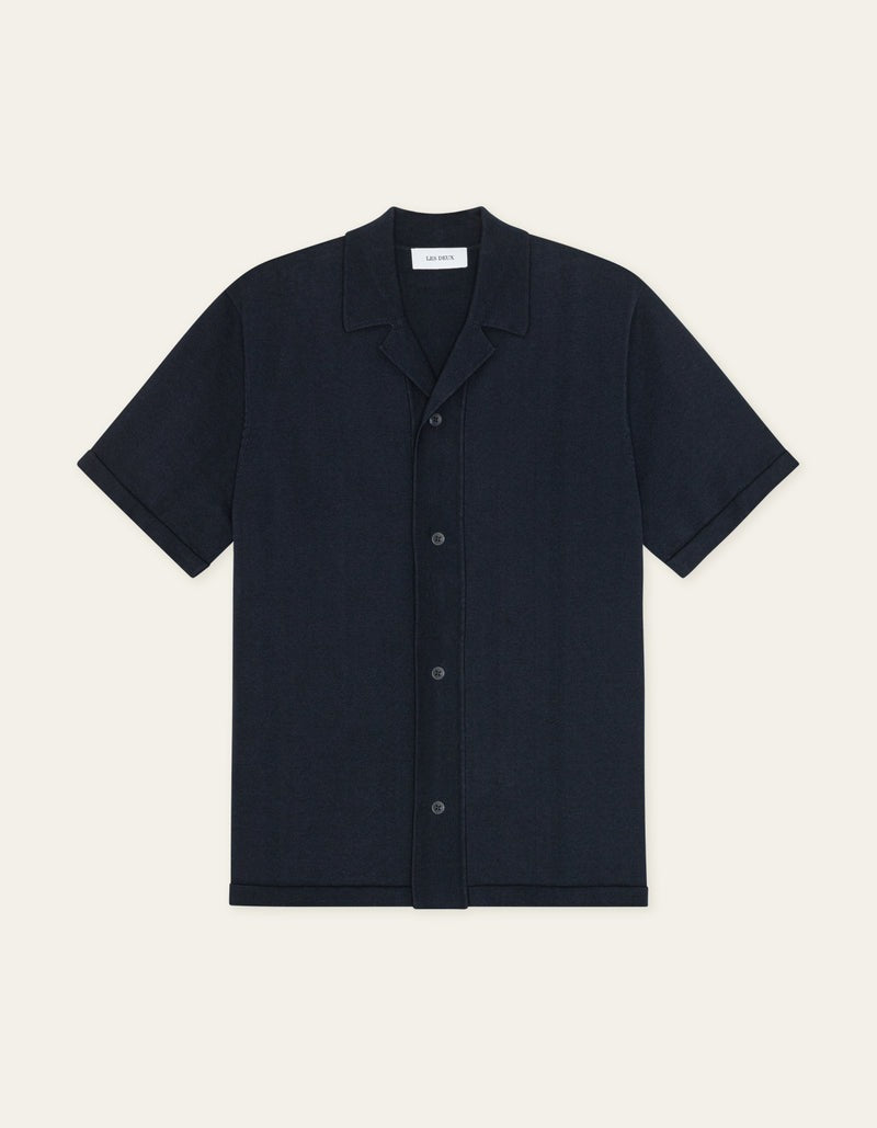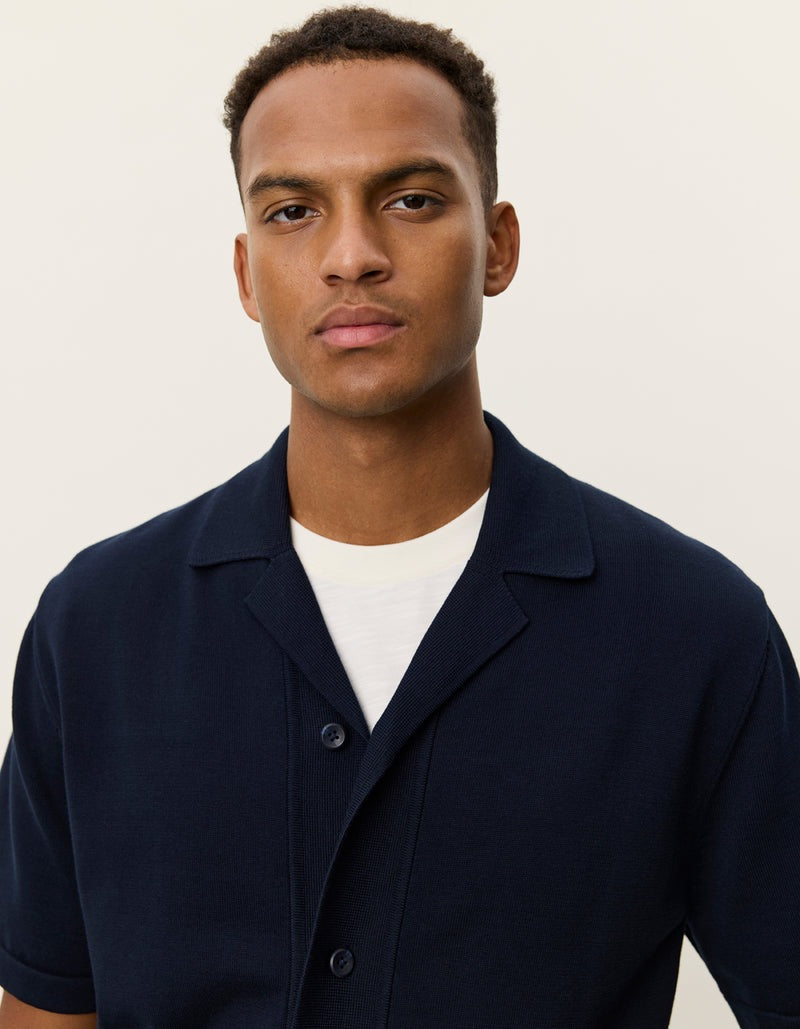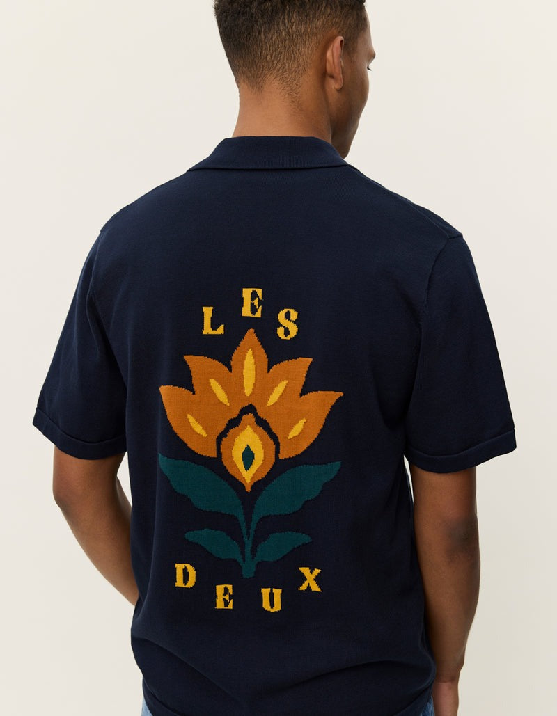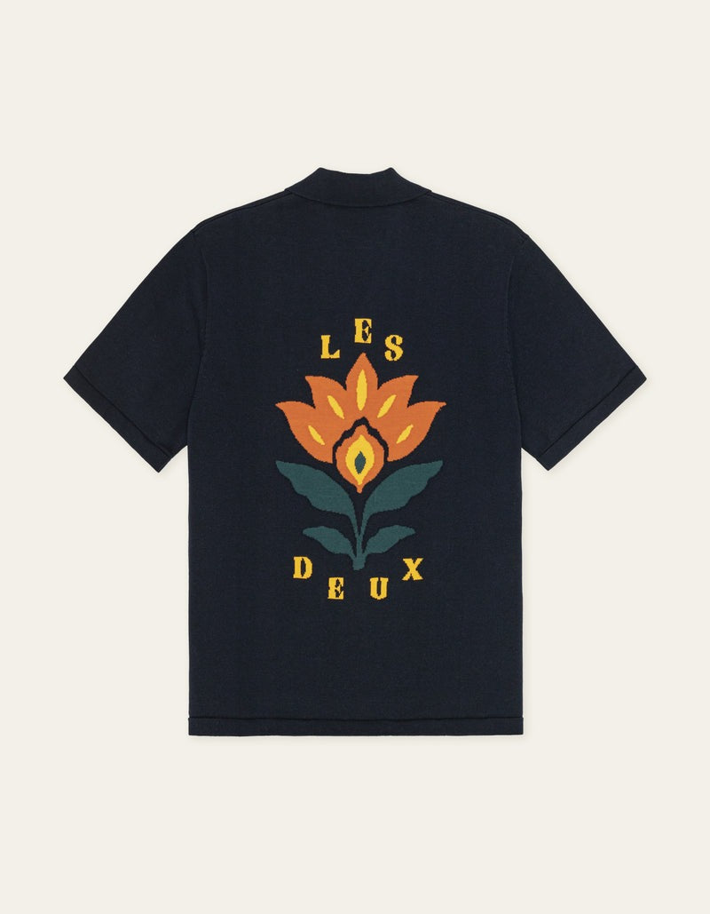 A soft knitted short sleeve shirt with a relaxed camp collar. The back features a seasonal jacquard artwork that adds a bold graphic expression to the clean front.