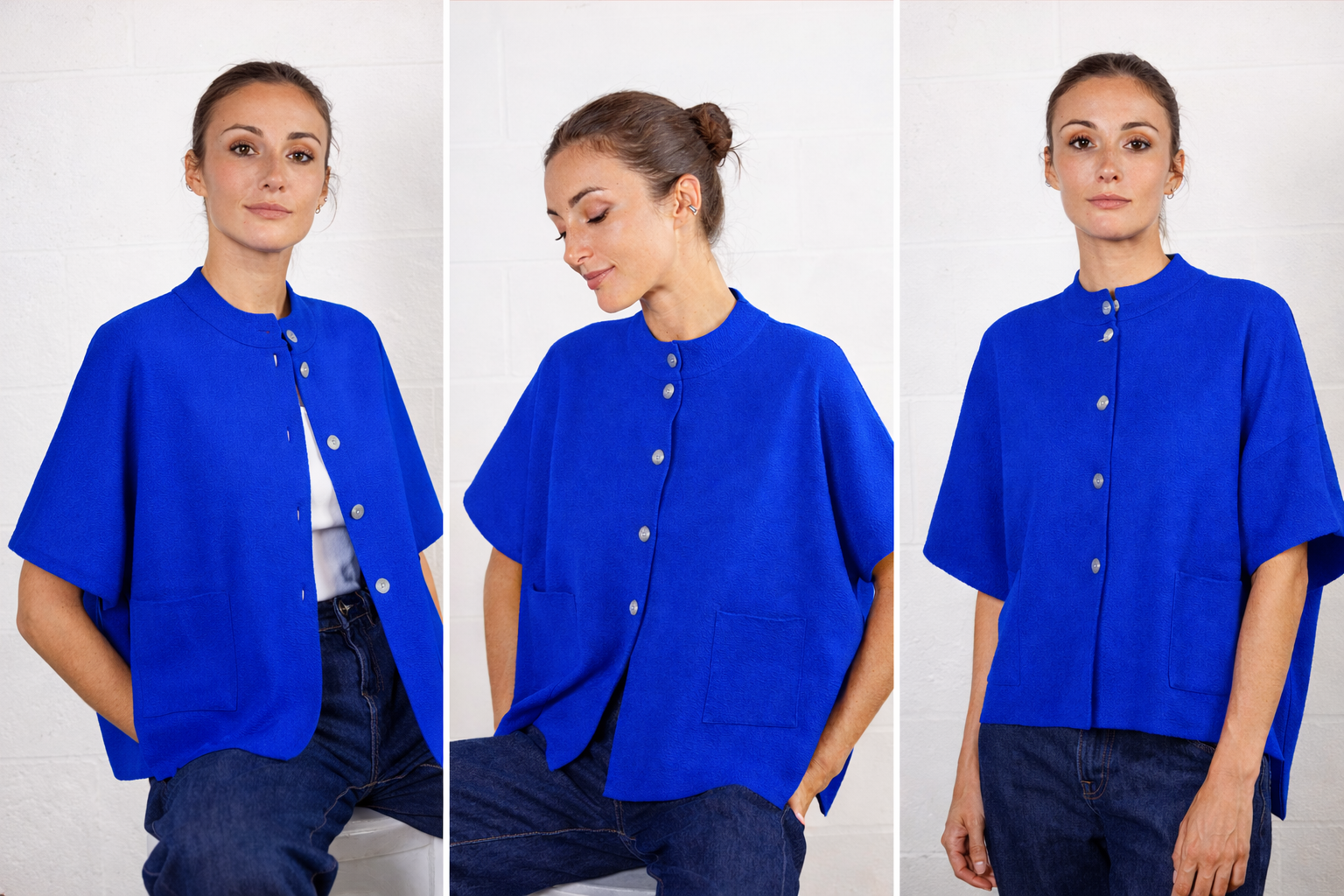 Featuring a refined round collar and button-front closure , this jacket stands out with its wide short sleeves and patch pockets , reinforcing its modern and functional style. Its intense Klein blue instantly brightens any outfit and adds a true fashion statement.