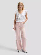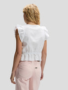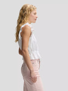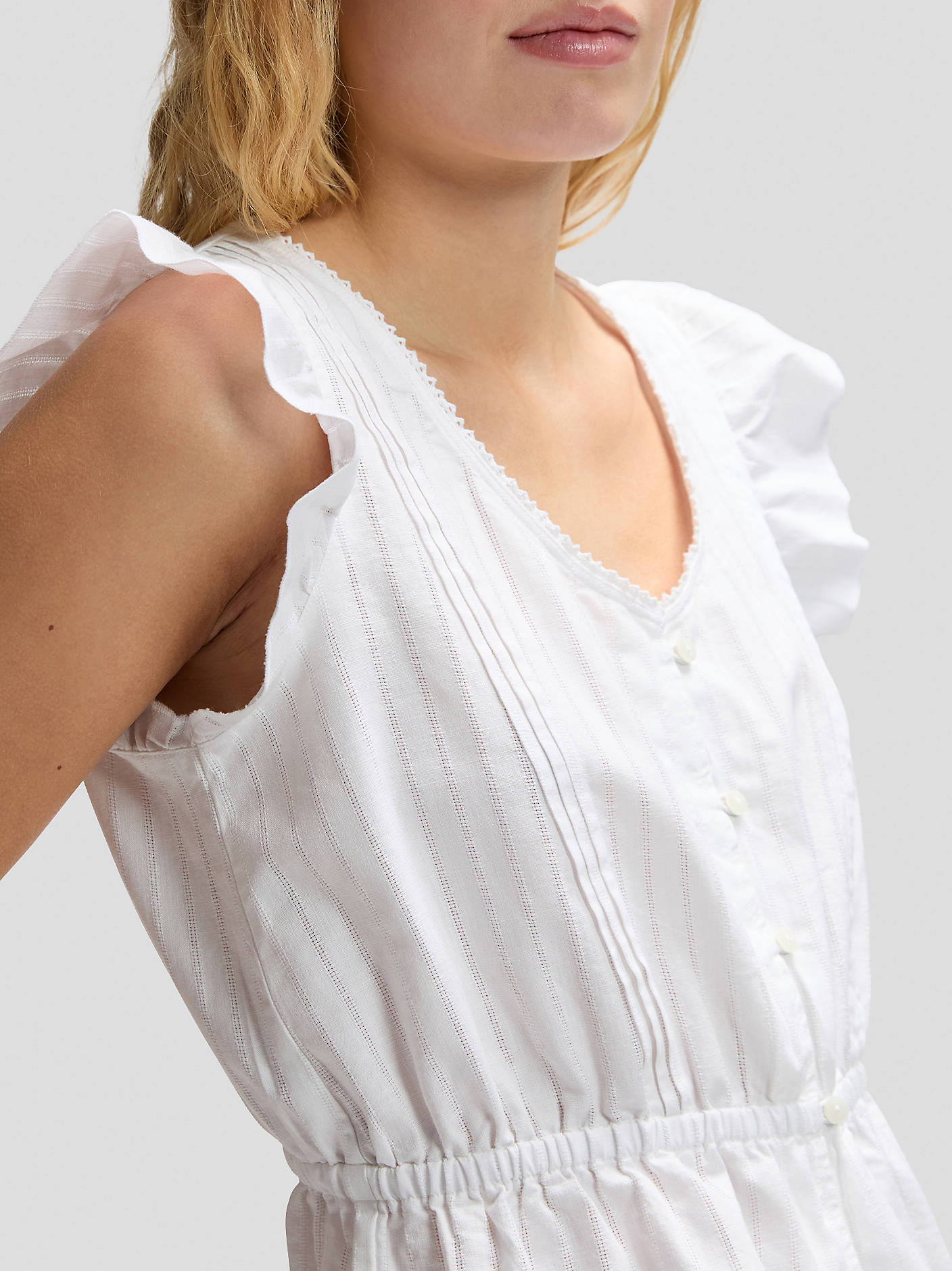 Sa taille élastiquée souligne subtilement la silhouette et crée un effet structuré et flatteur. Les détails plissés délicats, les petits boutons raffinés et les finitions en picot ajoutent une touche de charme et de légèreté à cette pièce pleine de caractère.