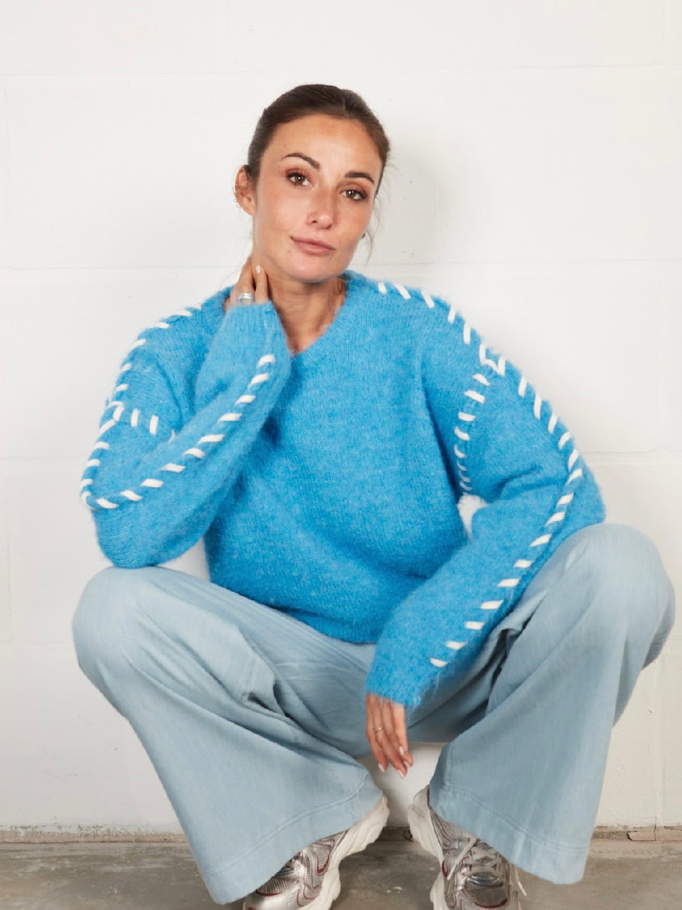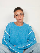Ce pull femme bleu signé Grenadine, marque belge, se démarque par ses surpiqûres blanches graphiques qui structurent la silhouette et apportent une touche contemporaine.