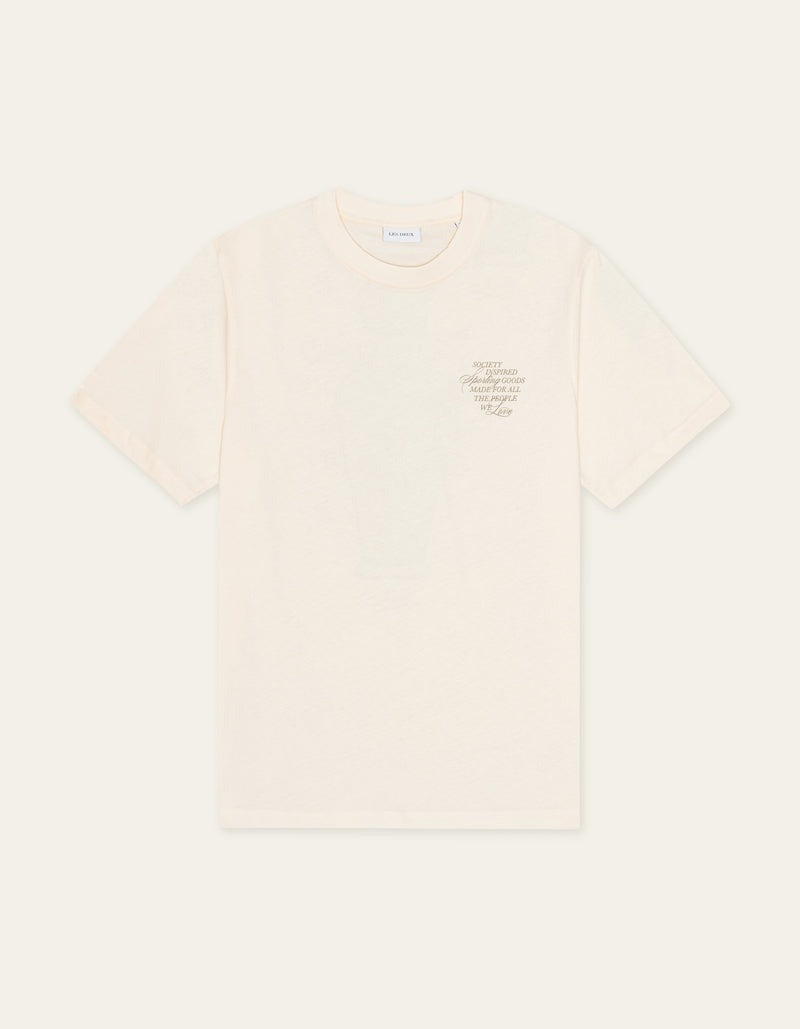 A clean regular fit tee with detailed seasonal graphics. It features a small collection themed chest print and a mixed artwork print across the back in contrast tones.