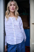 De fines lignes brodées multicolores, comme tracées à la main, parcourent la pièce et lui donnent un charme subtil, à la fois simple et plein de caractère. Facile à associer, il se porte aussi bien rentré dans un jean que laissé loose sur un pantalon taille haute.