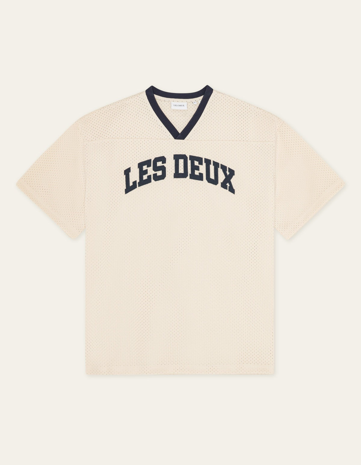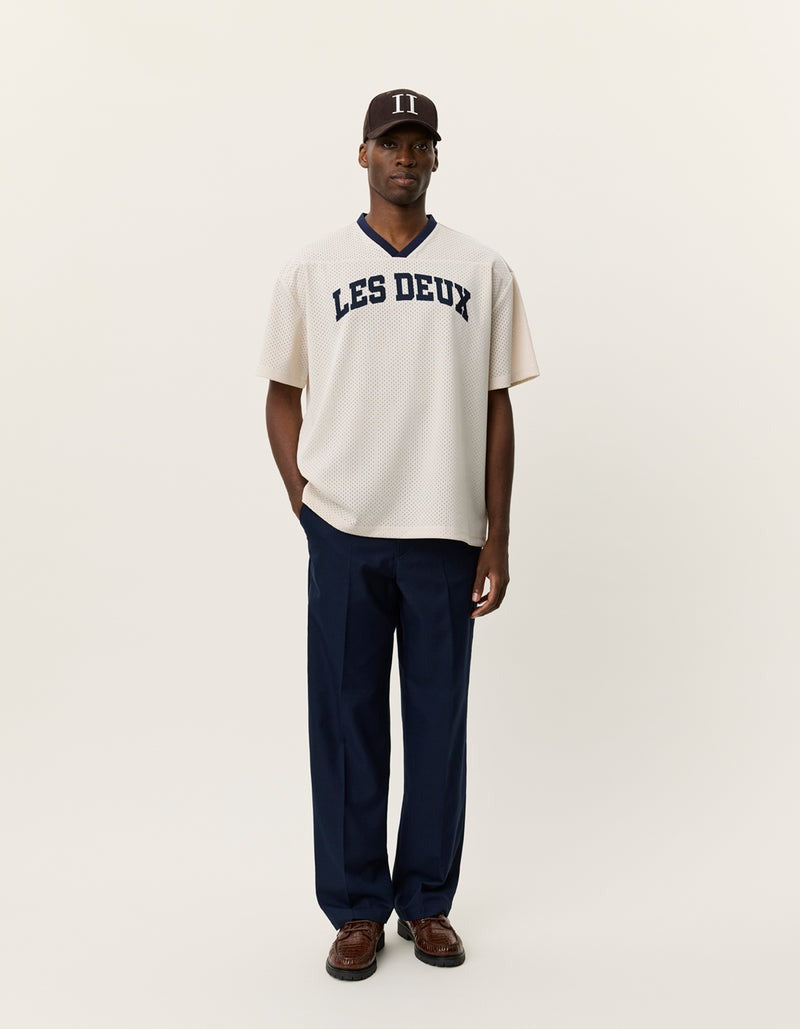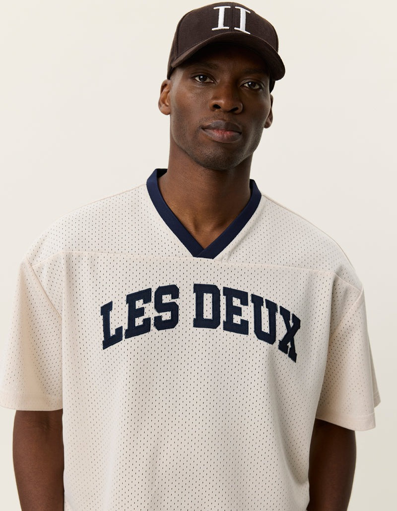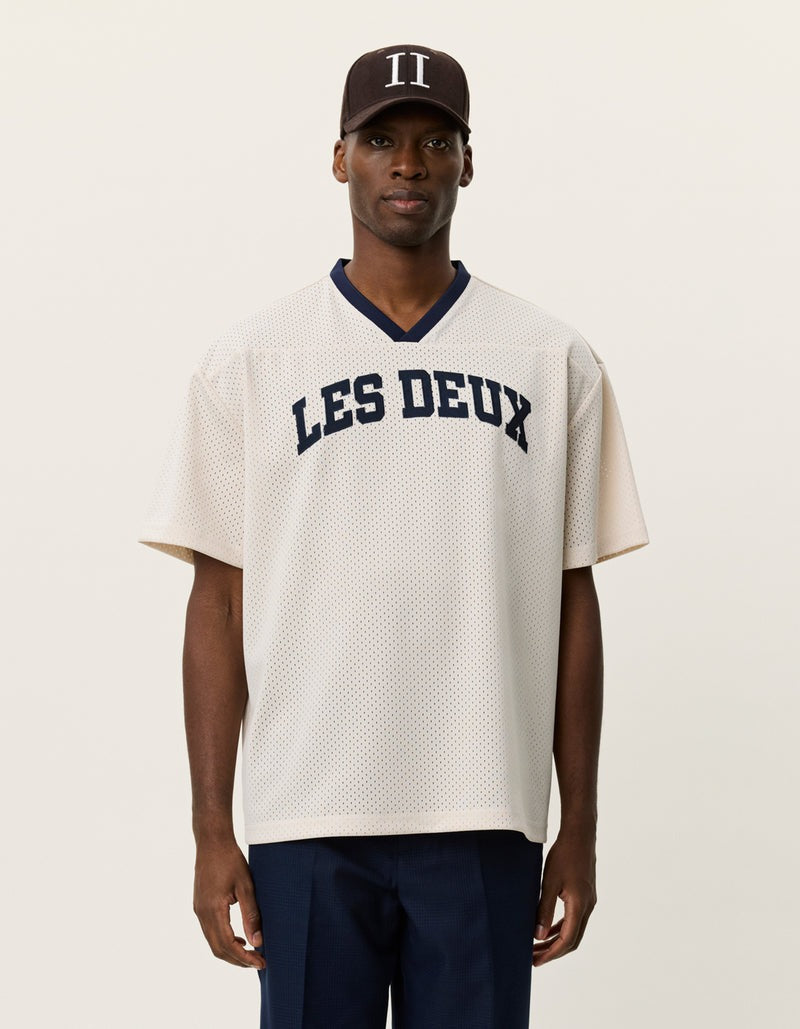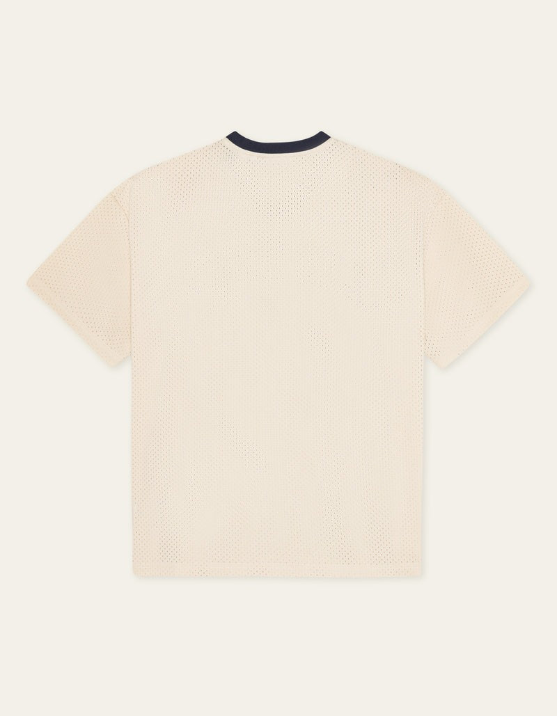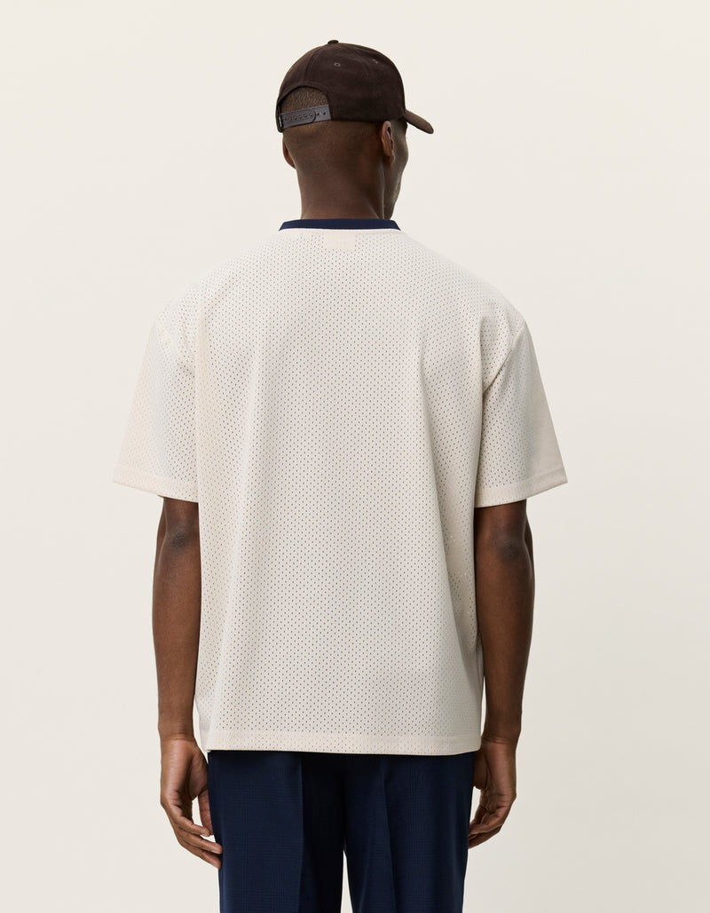 A basketball-inspired mesh tee with a relaxed, boxy silhouette. Made from recycled polyester with contrast neck tape and bold chest patches for a collegiate feel.
