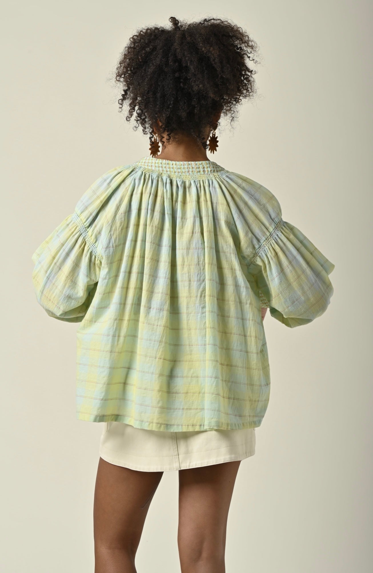 Ce top à manches longues bouffantes séduit par sa coupe ample et fluide, idéale pour une silhouette aérienne et élégante. Confectionné dans un tissu léger, il offre un confort parfait pour la mi-saison. Son encolure tunisienne avec patte boutonnée est soulignée par de délicates fronces au col et aux poignets, apportant une touche féminine tout en subtilité. Les finitions vichy contrastées ajoutent une note graphique et originale à cette pièce incontournable.
